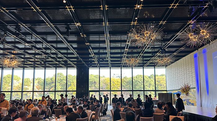 乾杯後にカーテンを開けて、名古屋城を見せる演出も引き続き好評で参加者から感嘆の声が漏れた。